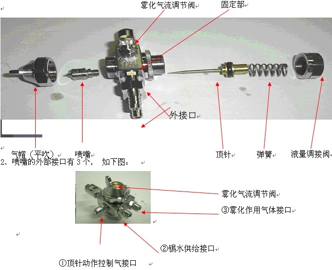 1、 噴咀将錫水(shui)霧化後噴射的(de)裝置,由噴芯、頂(ding)針、氣帽(平吹、圓(yuán)吹)、彈簧、液量調(diao)節閥、固定部、外(wai)接頭等構成。