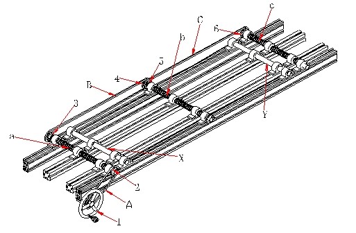 調整調幅手(shou)輪1、經鏈條A帶動(dong)從動輪2轉動,因(yin)從動輪2、3固定在(zai)同一調節螺紋(wén)軸a上,從而從動(dòng)輪3轉動,經鏈🔆條(tiáo)B再帶動從動輪(lun)4、5同時轉動,再經(jing)鏈條C帶動從動(dong)輪6轉動,因🈚從動(dong)輪2、3、4、5、6大小一樣,故(gu)整個傳動過程(chéng)是同步進行的(de),也就是說,在整(zhěng)個調幅過程中(zhōng),調節螺紋軸a.b.c同(tóng)步轉動,從而驅(qū)動可移動導軌(guǐ)在導向支撐軸(zhou)X、Y上等距離移動(dong),當然,此時傘形(xing)齒輪同時也在(zài)棱軸上滑動,從(cóng)而順利完成調(diào)幅動作。