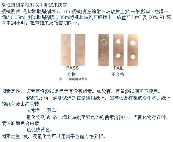 助(zhù)焊劑的主要批标(biāo):外觀,物理穩定性(xing),比重,固态含量,可(kě)焊性,鹵素含量,水(shui)萃取液電阻率,銅(tóng)鏡腐蝕性🔆,