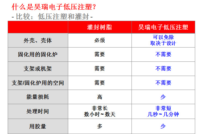 低(dī)壓注塑(注射(shè))成型工藝是(shi)一種使用很(hěn)小的注射壓(ya)✌️力(1.5~40bar)将封裝材(cai)料注入模具(jù)并快速固化(huà)成型(5~50秒)的封(fēng)裝工藝方法(fa),以達到絕緣(yuán)、耐溫、抗沖擊(ji)、減振、防潮✂️、防(fang)水、防👌塵、耐化(hua)☎️學腐蝕等等(deng)功🏃🏻♂️效 。