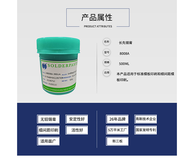 CX8008A屬于(yu)無鉛錫膏。粘(zhān)度安定性良(liáng)好,運輸、保管(guǎn)、使用方便;良(liáng)好的細間距(jù)印刷性能,印(yin)刷形狀精細(xì);預防預熱時(shi)的塌陷,有效(xiao)防🎯止橋連及(ji)錫球的發生(shēng);活性好,暖爱🚩免费观看视频在线㊙️适用(yòng)面廣。